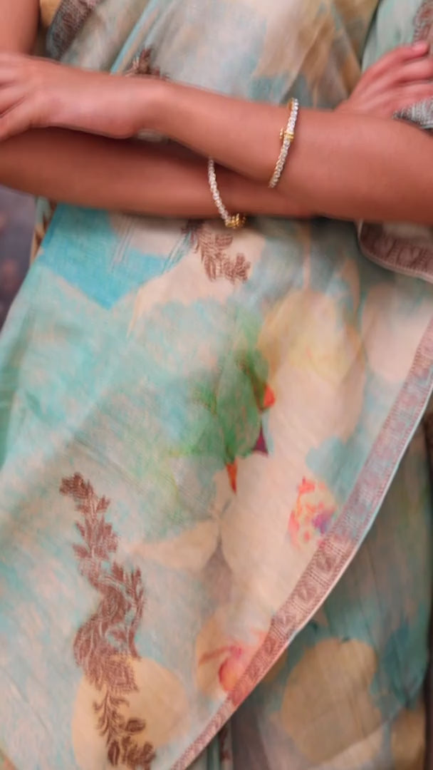 This Powder Blue Handloom Linen Saree keeps it cool with subtle floral patterns across the fabric. The breathable linen in a refreshing blue and zari weaving, makes it perfect for comfort without sacrificing style. Comes with a matching blouse piece. Ideal for daytime functions and casual wear.