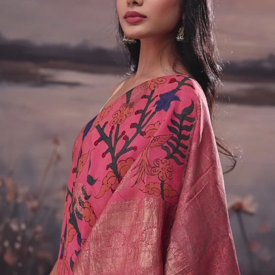 This Punch Pink Gadwal Kalamkari Saree blends two traditional crafts into one beautiful piece. The hand-painted elements add artistic value to the structured gadwal weave. Includes a coordinating blouse piece. Perfect for cultural events and temple visits.