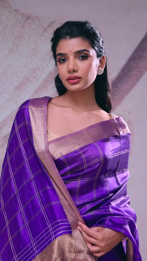Purplish Blue Banarasi Checks Poona Silk Saree
