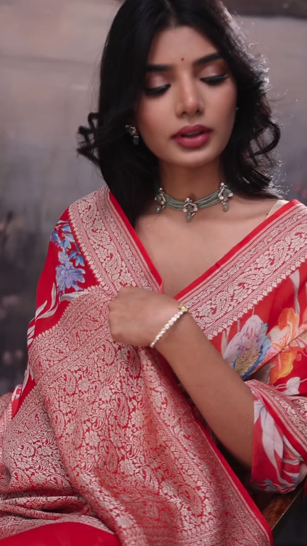 Raspberry Red Printed Georgette Banarasi Saree