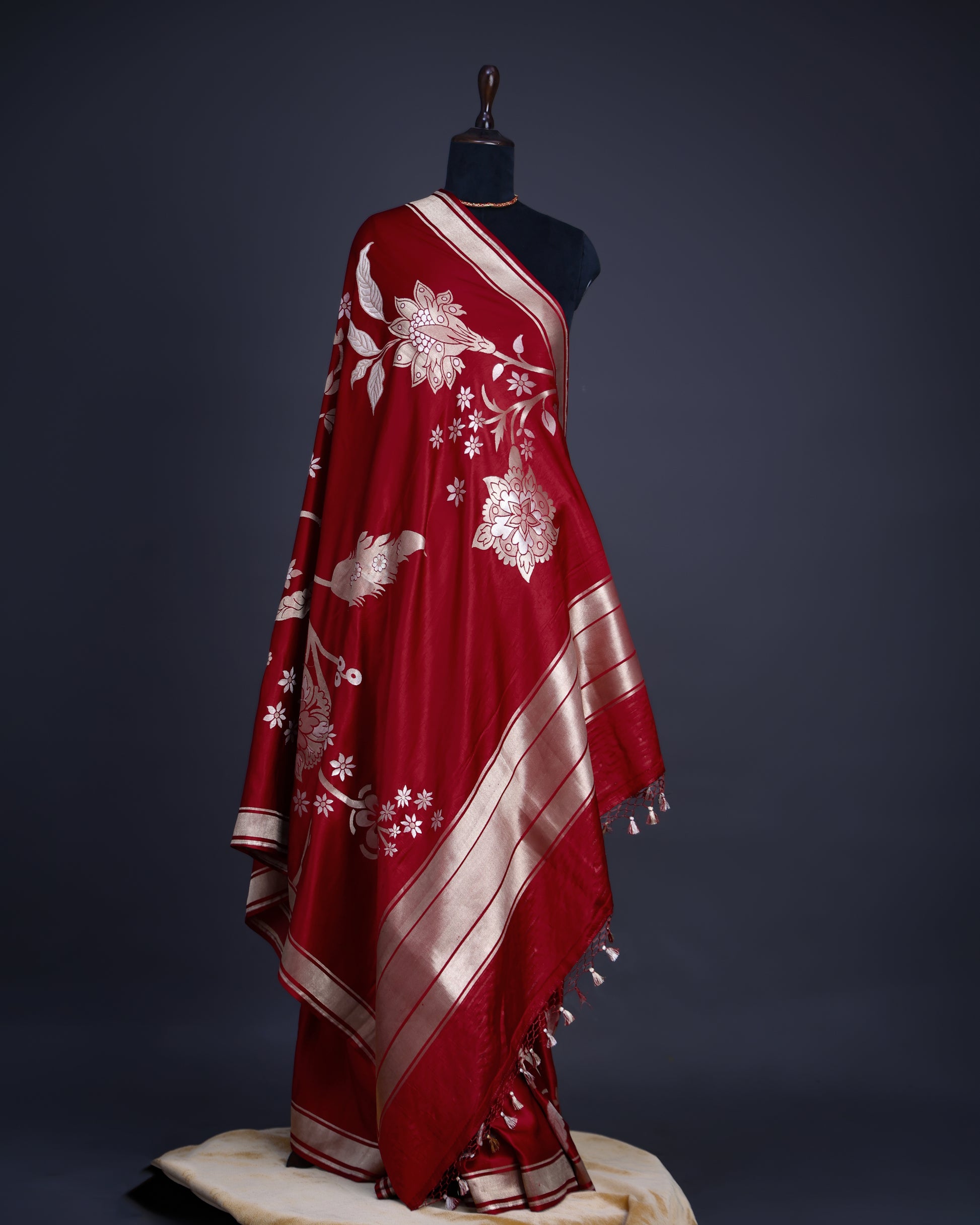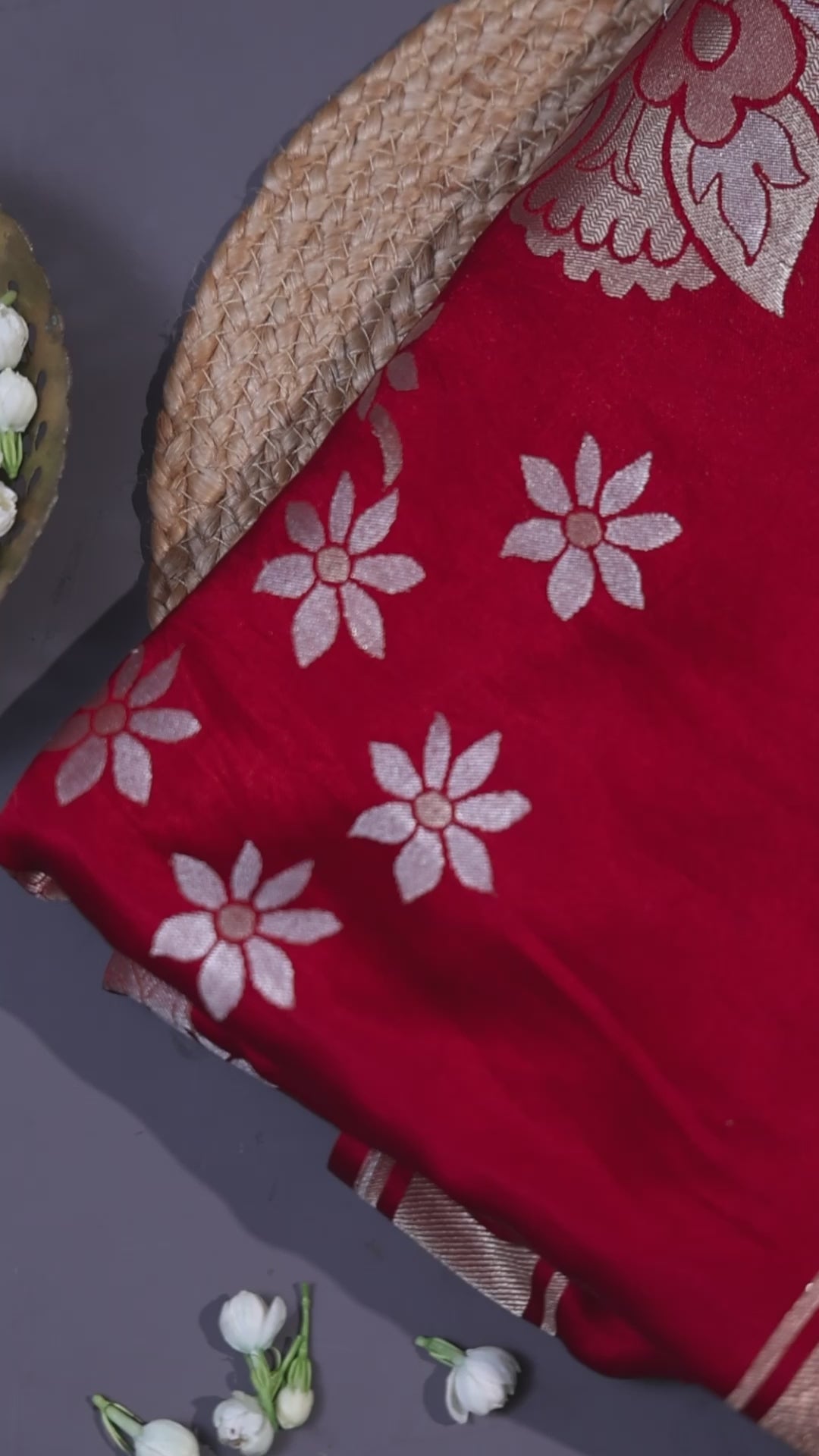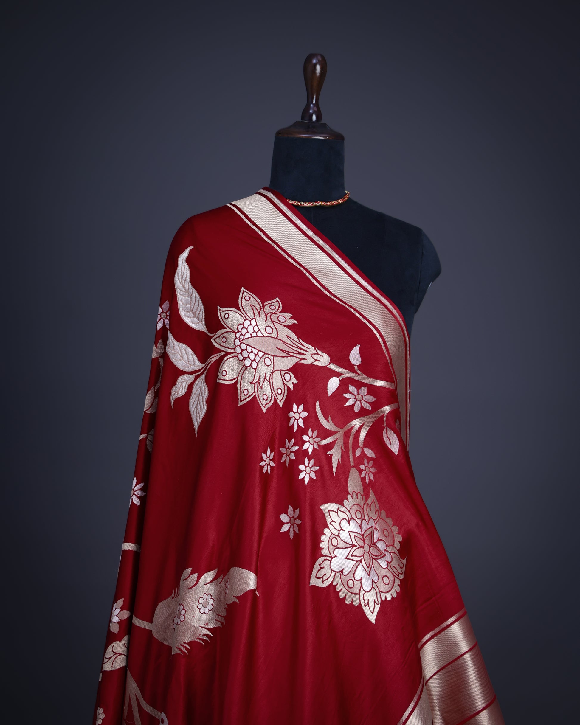 Red Designer Banarasi Katan Satin Saree with Floral Patterns