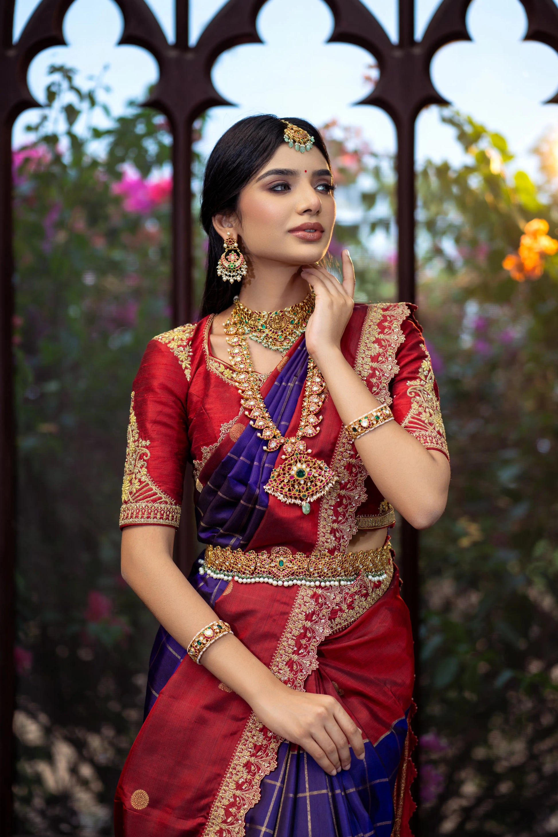 Make a majestic statement with this Royal Blue Kanjivaram Silk Saree, a stunning bridal drape that blends traditional artistry with opulent detail. The saree features golden zari checks across a rich blue silk base and is paired with a fully embroidered contrast work blouse, crafted to elevate your wedding-day look.