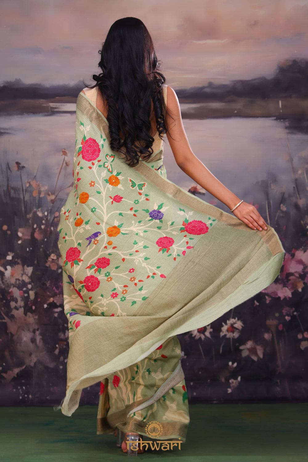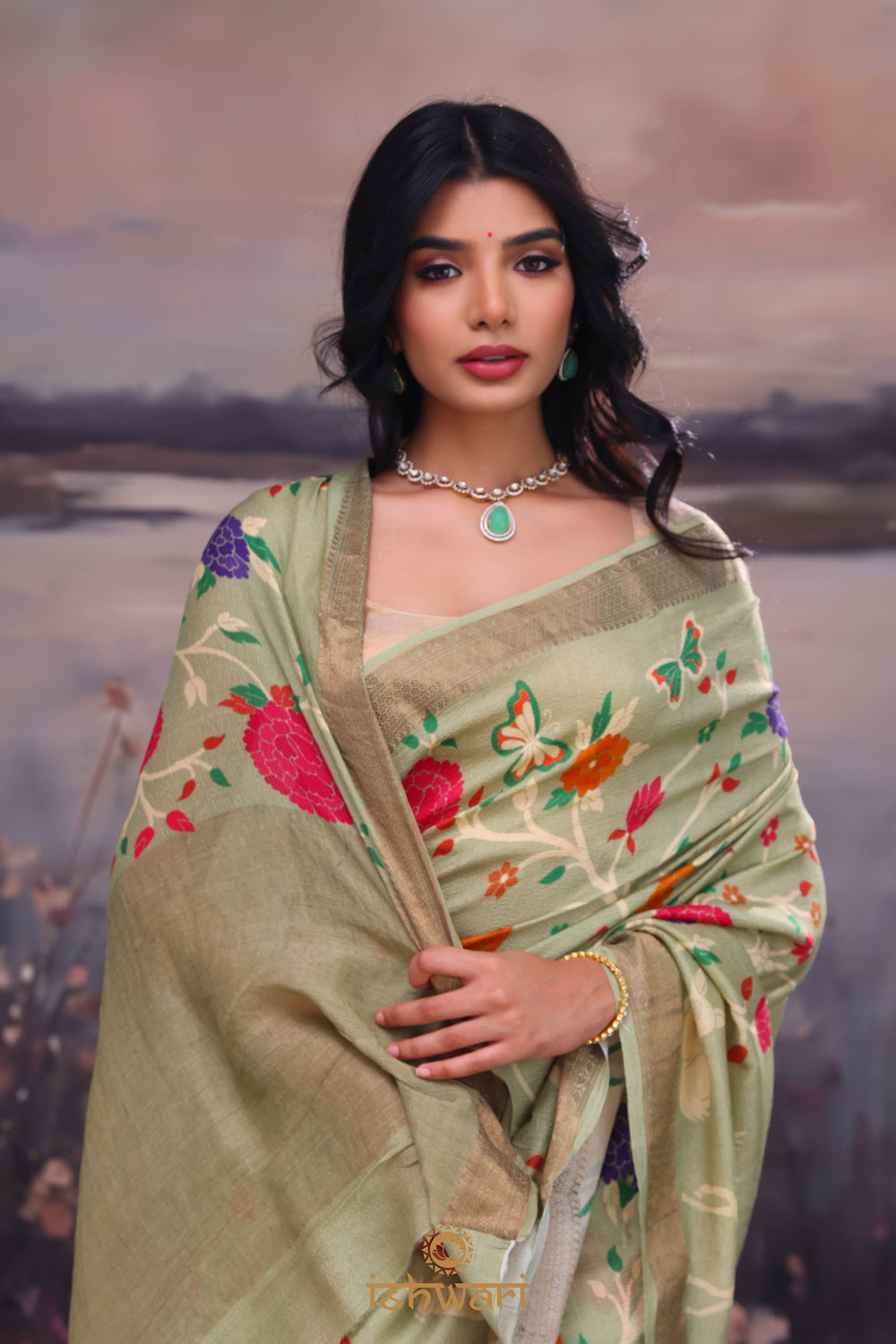 This Sage Green Moonga Silk Saree combines soothing green tones with striking digital floral-animal patterns. The traditional banarasi weave with modern printing creates a balanced look. Comes with a matching blouse piece. Ideal for weddings and formal occasions.