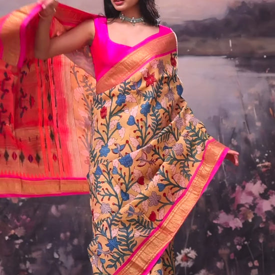This Sand Yellow Kalamkari Paithani Saree brightens any room with its sunshine hue and hand-painted artistry. The traditional paithani motifs celebrate our rich textile heritage. Includes a coordinating blouse piece. Perfect for festive occasions and temple visits.