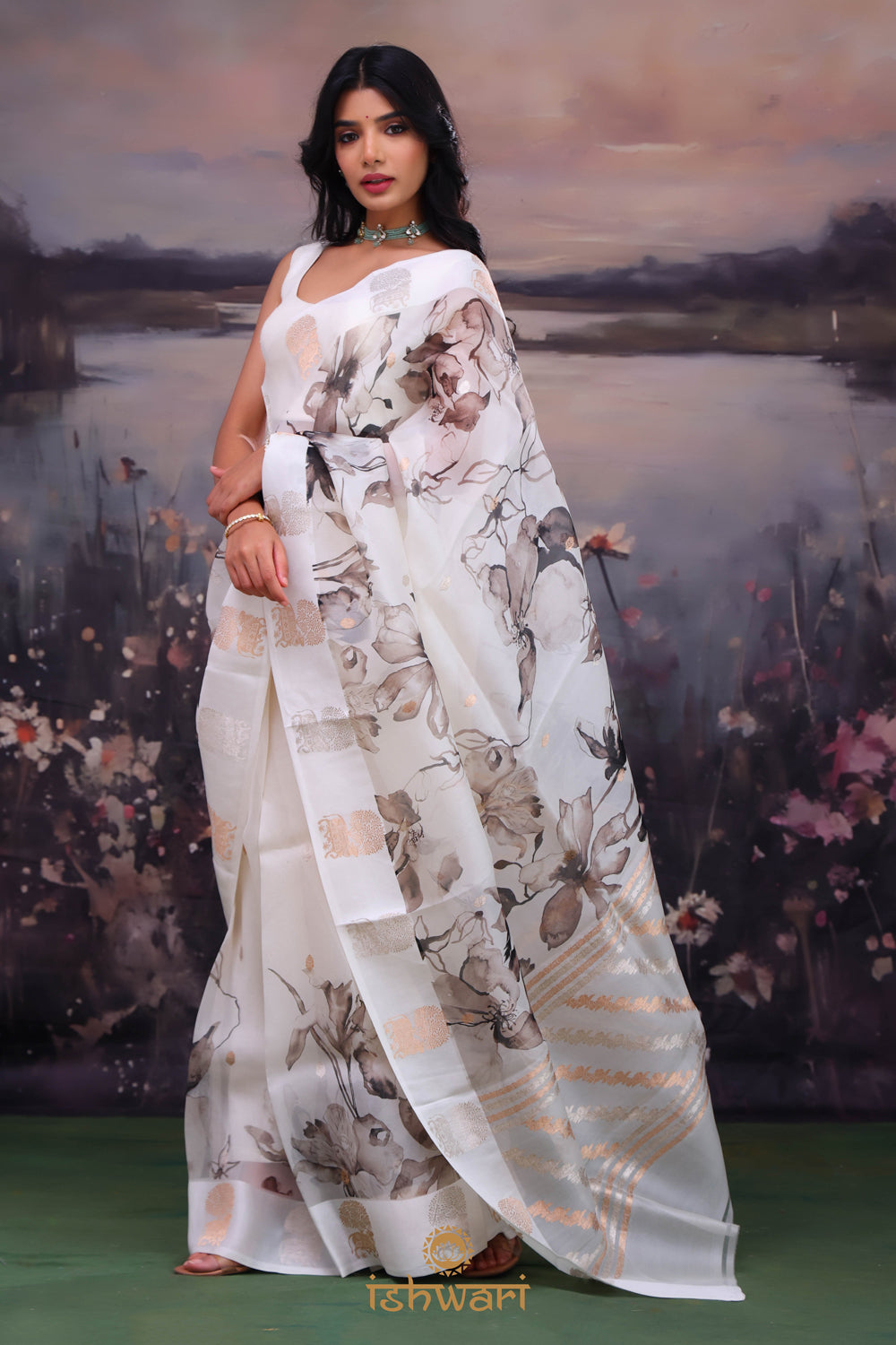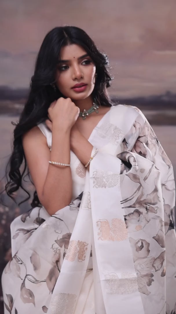 Soft White Floral Print Organza Banarasi Saree