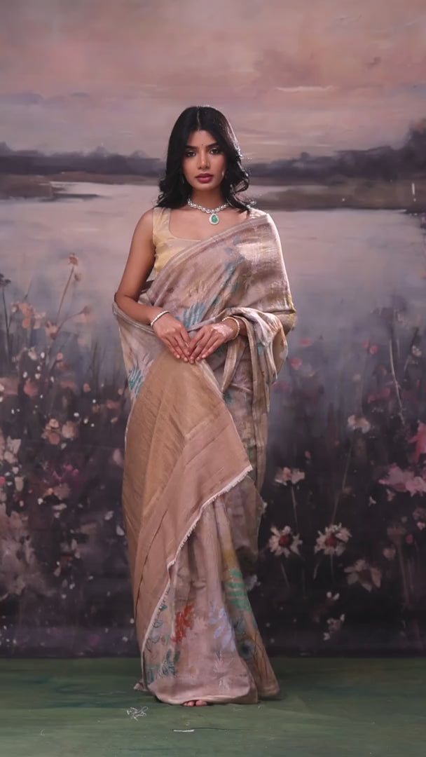 This Taupe Brown Handloom Linen Saree showcases delicate floral patterns throughout. The earthy tone combined with the natural texture of linen creates a grounded, timeless look. Comes with a matching blouse piece. Great for day events and casual gatherings.