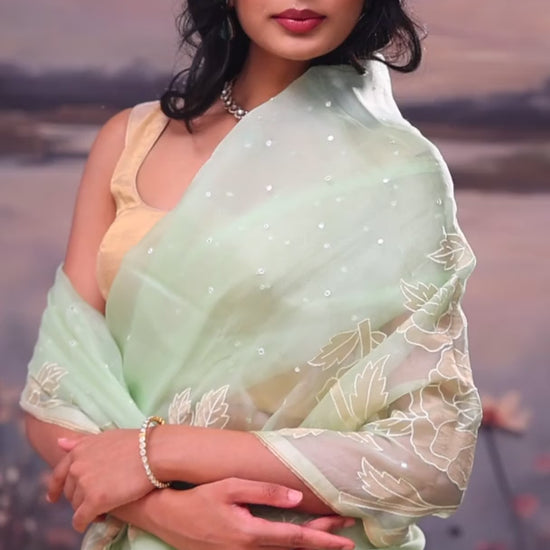This Tea Green Organza Saree makes a statement with tiny mirror embellishments. The partly body designed with applique floral pallu and catch the eye with every step. Comes with a matching blouse piece. Perfect for festive celebrations and special occasions.