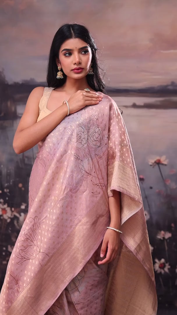 This Turkish Pink Floral Banarasi Tissue Saree makes a statement with its bold pattern work and traditional weaving. The generous floral motifs create visual impact. Includes a coordinating blouse piece. Perfect for weddings and major celebrations.